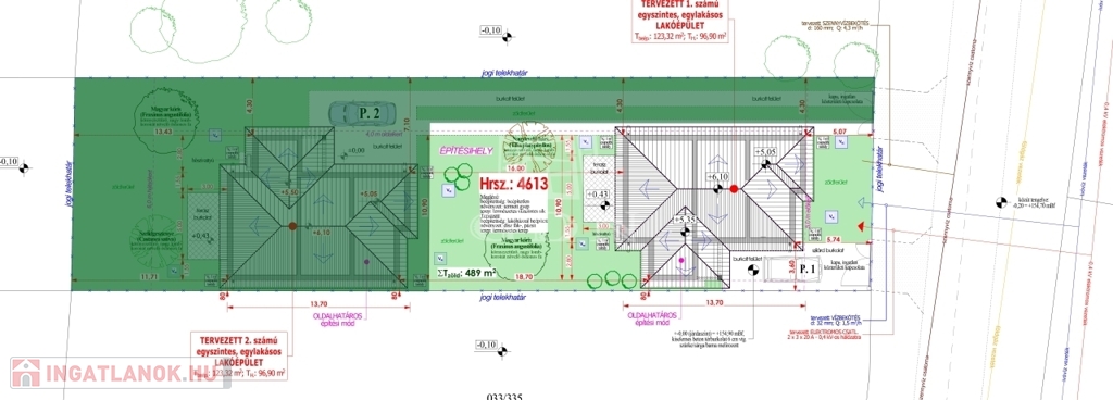 A hátsó ingatlan egy 3 méter széles a telek jobb oldalán kialakított úton lesz megközelíthető, 522 m2 telekrésszel fog rendelkezni., vételára: 74.900.000.- Ft.