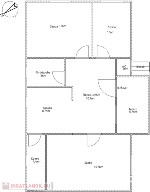 A ház tágas, jól alakítható terekkel rendelkezik: nagy terasz, világos étkező–előszoba, konyha, fürdő, nappali és két hálószoba. A tetőtér beépíthető, így az ingatlan tovább bővíthető.