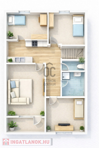 A tetőtéri szint nappali, konyha–étkező, 3 hálószoba, zuhanyzós fürdő, külön WC kiosztású.