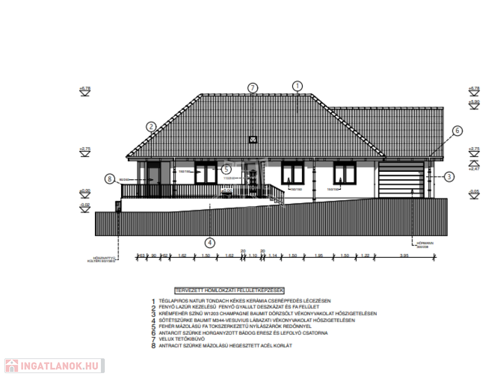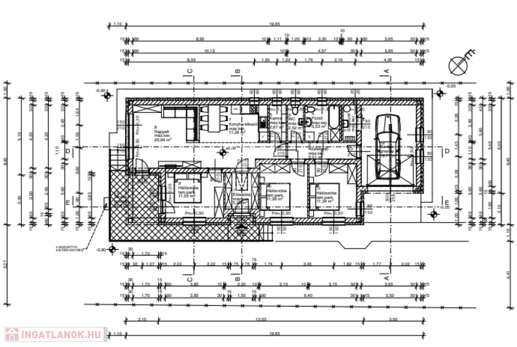 - nappali 26,94 nm,- konyha-étkező 11,26 nm, -háló 11,55 nm, -előszoba 5,28 nm (tetőtérre feljáró kialakítva, lehajtható létrával), -háló 11,36 nm, - háló 11,34 nm, -kamra 2,67 nm, - wc-kézmosó 2,52 nm, -fürdő-wc 5,53 nm, -garázs 19,71 nm, -gépészeti helyiség 2,15 nm, -közlekedő 5 nm, - fedett terasz 22,8 nm.