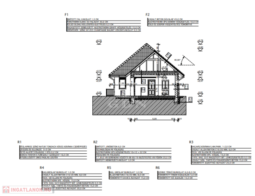 B30-as Porotherm tégla falazatú, külső 10 cm-es grafitflex szigeteléssel. A válaszfalak 10 cm-es 10 N+F Porotherm típusú.