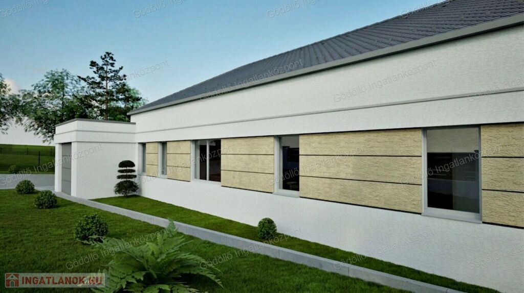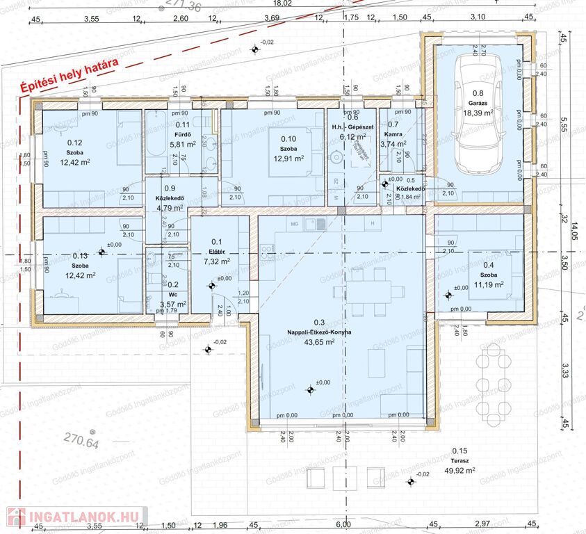 - Előtér, tágas nappali-konyha-étkező, közlekedő, 4 szoba, egy zuhanyzós és egy kádas fürdőszoba, háztartási helyiség-gépészet, kamra, valamint 18,39nm-es garázs és 49,92nm-es terasz kerül kialakításra.