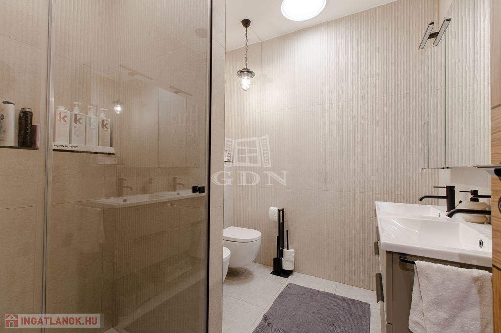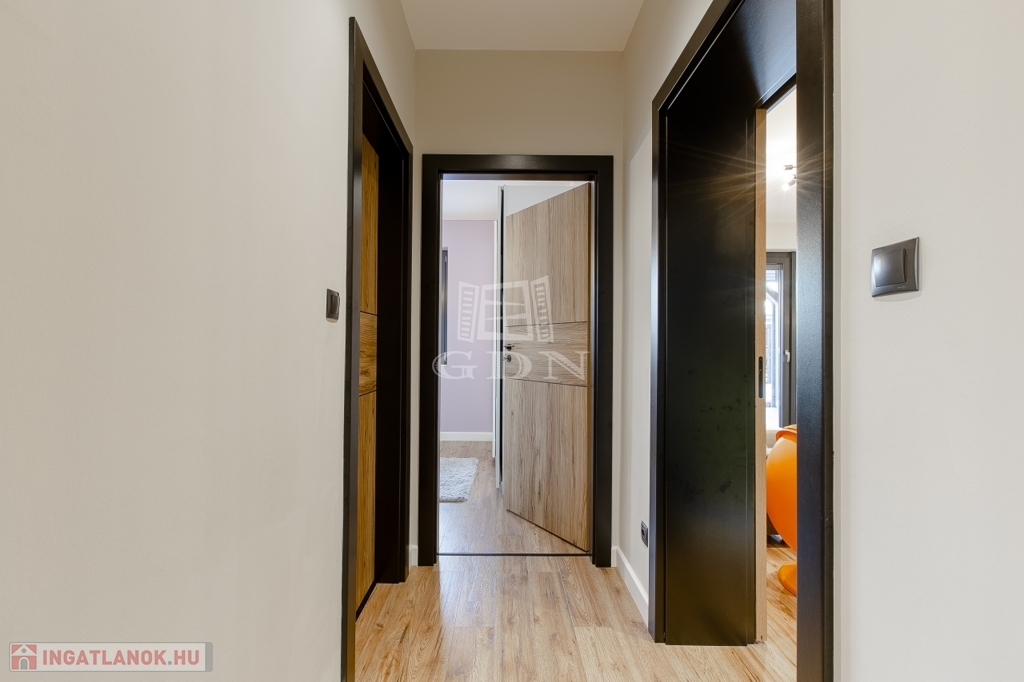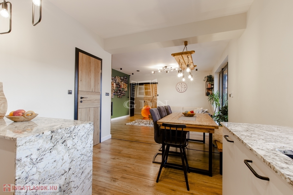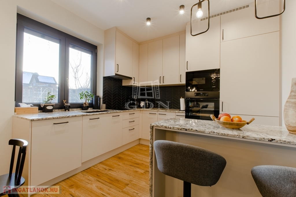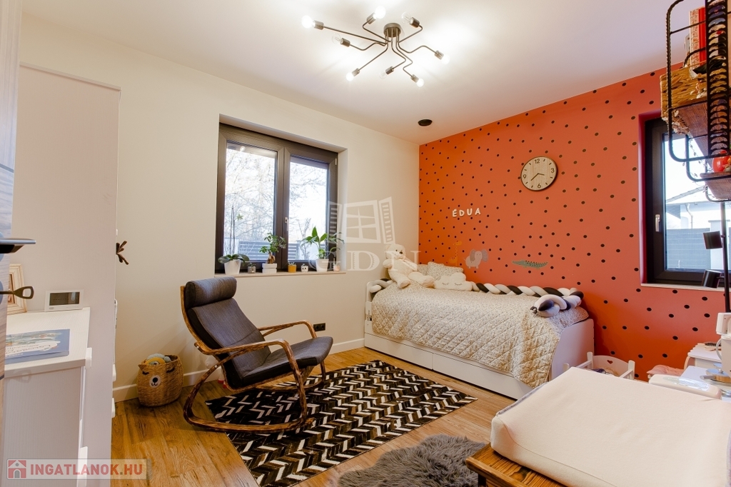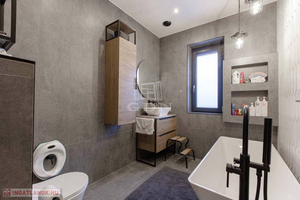 Kényelem és minőség jellemzi az egész házat belülről, prémium anyagok és minőségi egyedi gyártású falburkoló megoldások, gránit pultos praktikus konyhával, melyből a szülő egyaránt rá lát az udvarra és a nappaliban játszó gyermekekre is. A dupla fürdőszoba lehetőséget ad a gyermekeknek a kádas fürdőszobára, illetve a szülői hálószobában lévő fürdőszoba pedig a felnőttek intimitására.