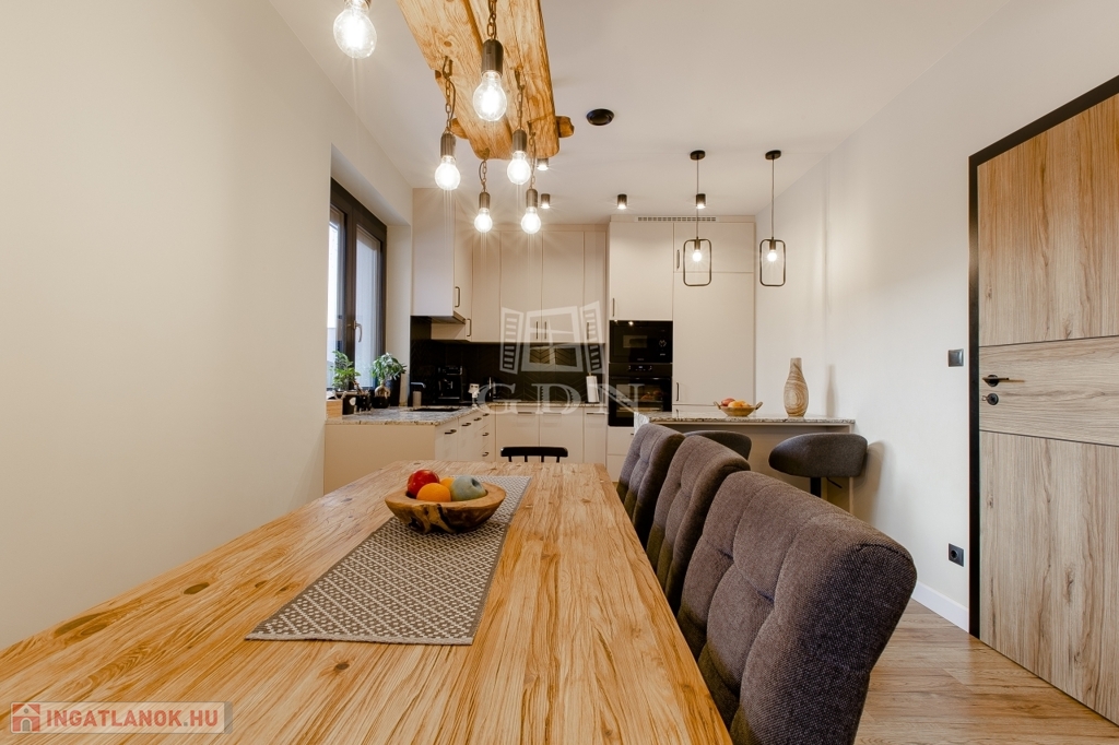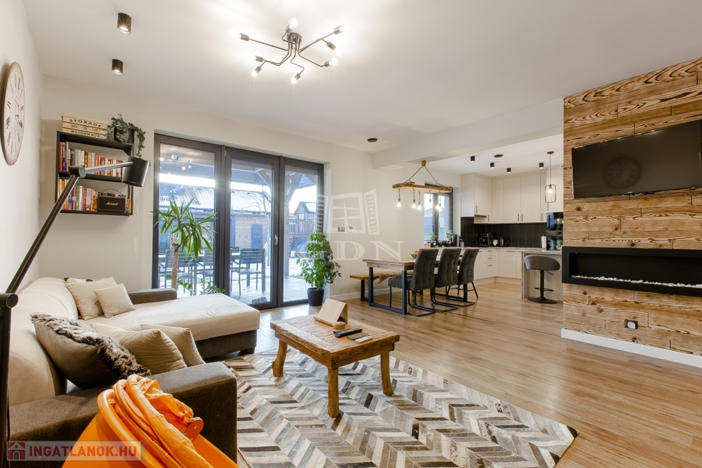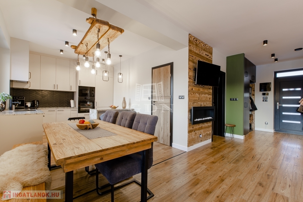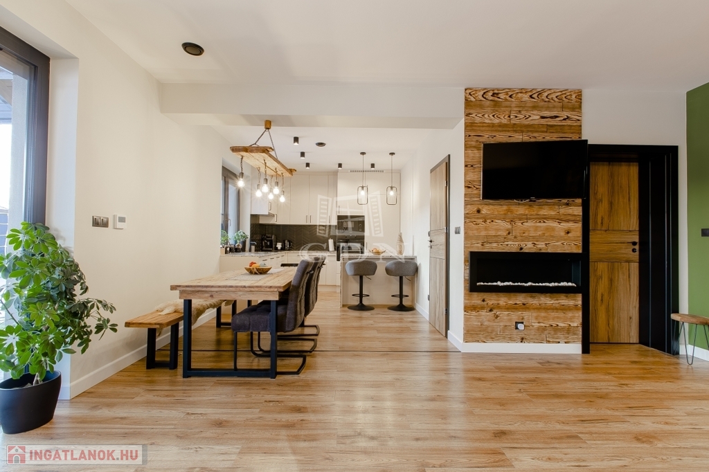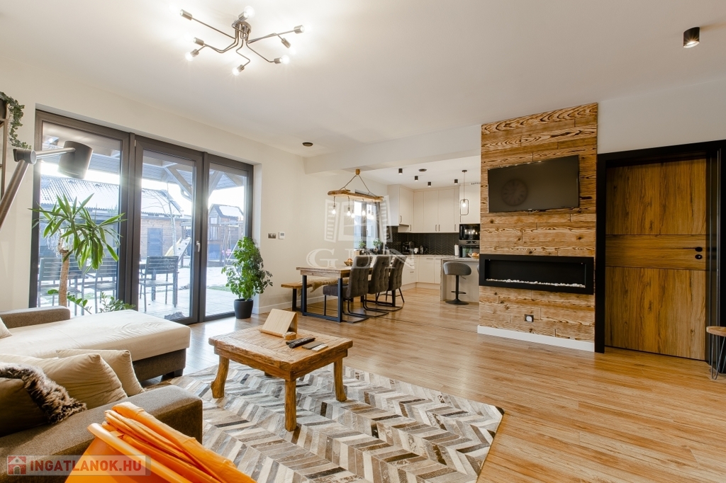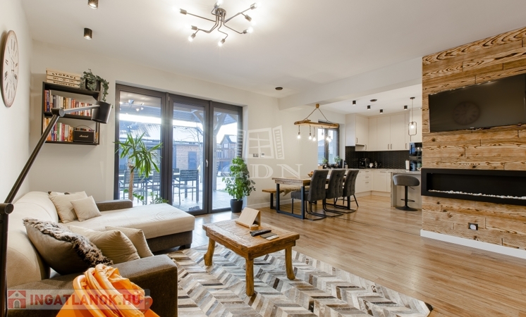 Megvételre kínálok a Pest vármegyei Szadán, 880 nm-es telken, déli fekvésű, nettó 121 nm-es, bruttó 204 nm-es, amerikai konyhás nappalival ellátott 3 + 1 félszobás, újszerű állapotban lévő, kiemelten felszerelt, ikerház felet.