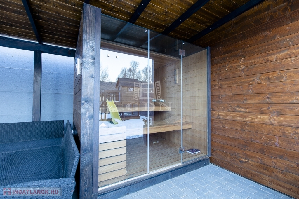 A 880 nm-es területet két elektromos nagykapun keresztül közelíthetjük meg autóval két utcáról, az egyik beálló a garázsba, míg a másik beálló a fedett beállóhoz biztosít bejutást. Udvaron található egy 80 nm-es fedett terület, melyből 25 nm hátsó grillező terasz vagy fedett beálló, a maradék épület Finn szauna, illetve tároló. Tervezésnél gondoltak a nyári hőség elviseléséhez, egy 3x6 méteres medencére komplett gépészettel, hőszivattyúval, külön játszótérre a gyerekeknek, illetve egy csepegtető rendszerrel ellátott 6 nm-es Leier magaságyásra is. Az udvar szépségéért öntözőrendszer felel amit fúrt kút táplál, a kényelemért pedig egy robot fűnyíró dolgozik.