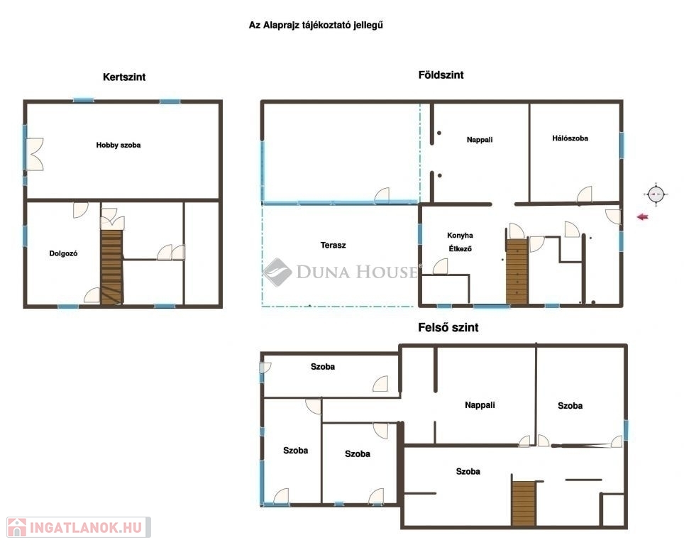 Felső szinten: nappali, 5 hálószoba, 2 fürdőszoba WC-vel.