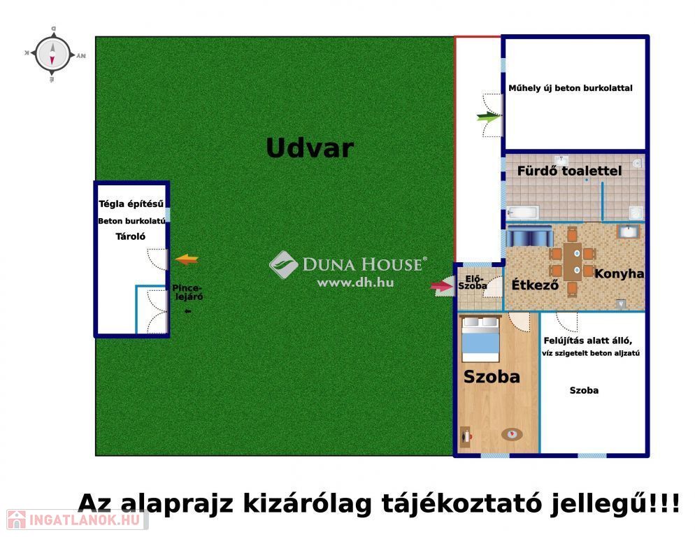 Bejárati ajtón egy előszobába, majd a étkezős -nappalis konyhába lépünk, innen balra kádas fürdőbe, melyből nyílik a toalett helység zuhanyzóval. Étkezőből két külön nyíló szoba található. Egyik szoba felújítása jelenleg is tart új beton aljzatot kapott alá fólia és szigetelés lett lerakva, falai kartonozása már elkezdődött.