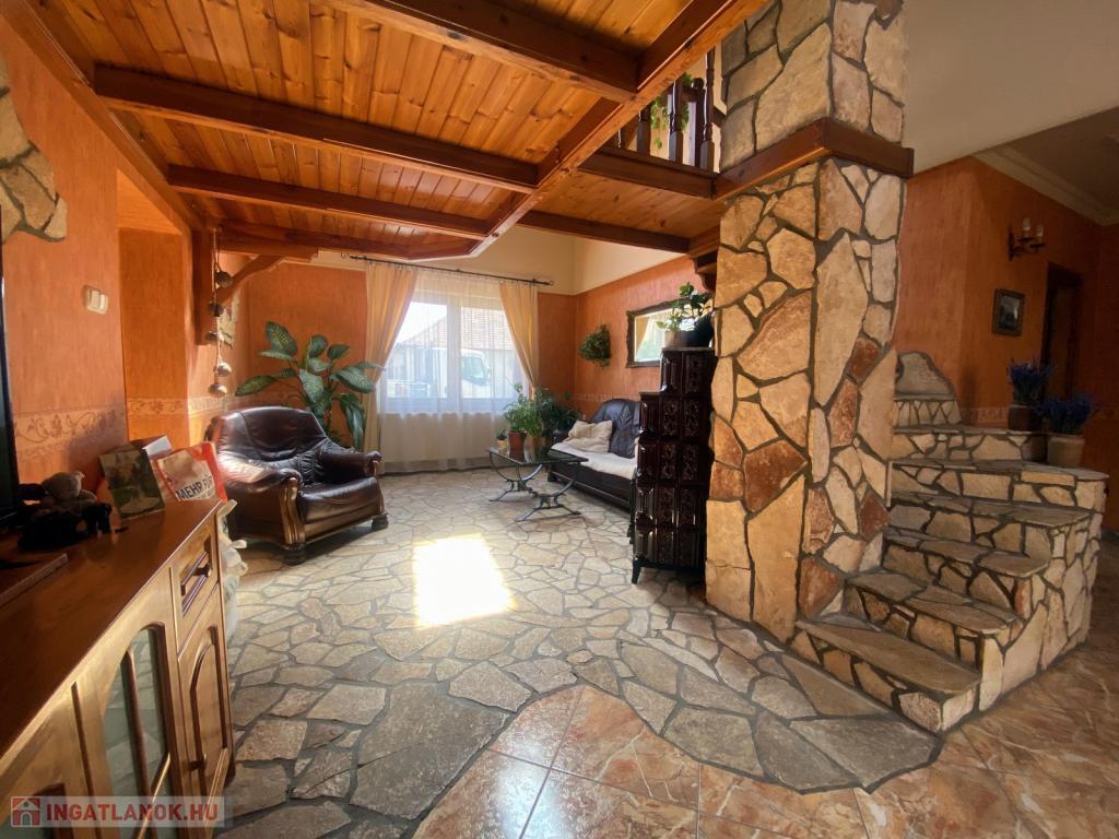 A tágas nappalit (kb.40 nm) spanyol csempe és természetes homokkő burkolja, a mennyezetet fa burkolatok díszítik, melyek melegséget és karaktert adnak a térnek. Ideális helyszín meghitt családi ebédekhez és baráti összejövetelekhez, ahol jókat lehet enni, nevetni, együtt lenni. Itt a belmagasság 4,40 cm, így állógaléria növeli az életteret, ahol kellemes könyvtárszoba, dolgozórész, iroda lett kialakítva, a home-office-ban dolgozók örömére.