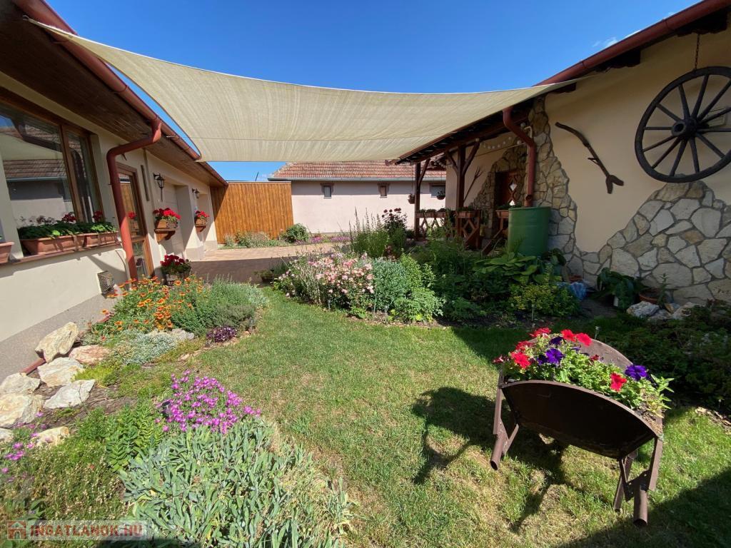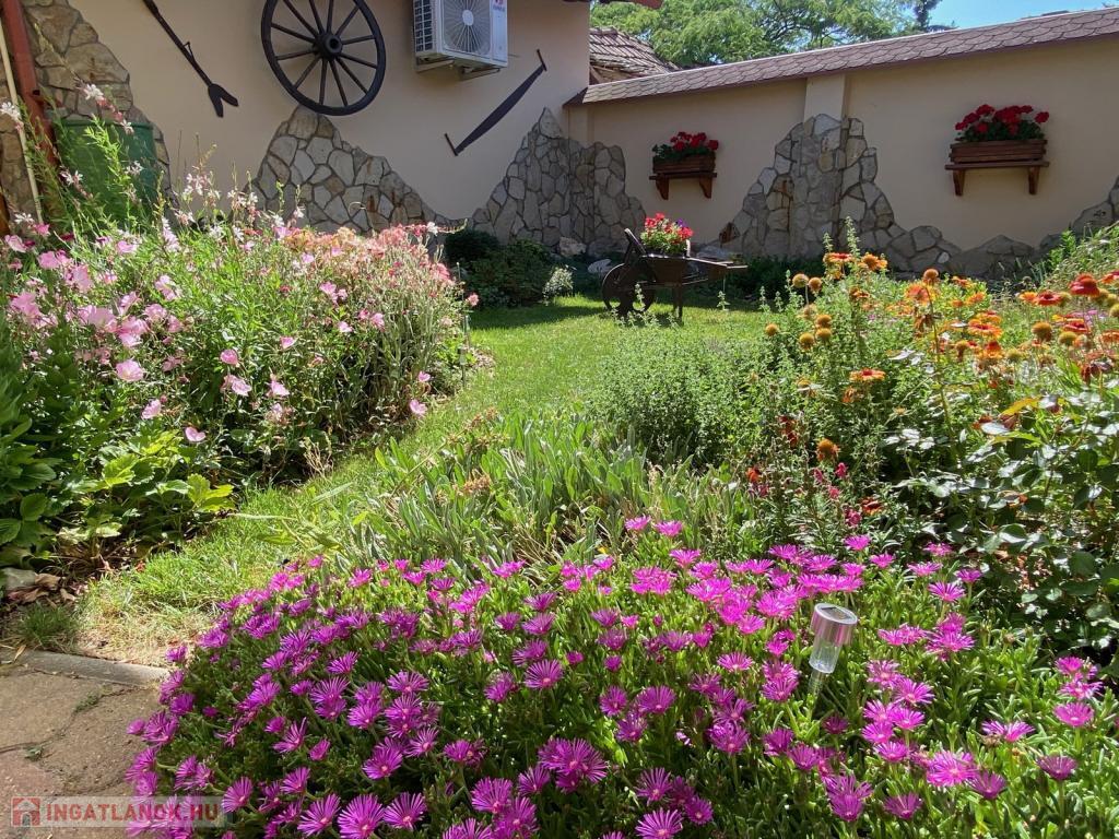 A bejárat előtt fedett terasz hív pihenésre, az udvar nagy részét térkő borítja, és egy mesésen kialakított, csodás virágos gondozott kert, kis tó halakkal, tavirózsákkal és hangulatos híd, igazi kis édenkert. Én teljesen beleszerettem, ezt látni kell!
