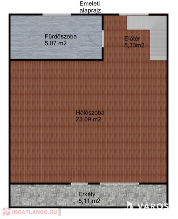 - Az emeleten fürdőszoba, hálószoba, erkély