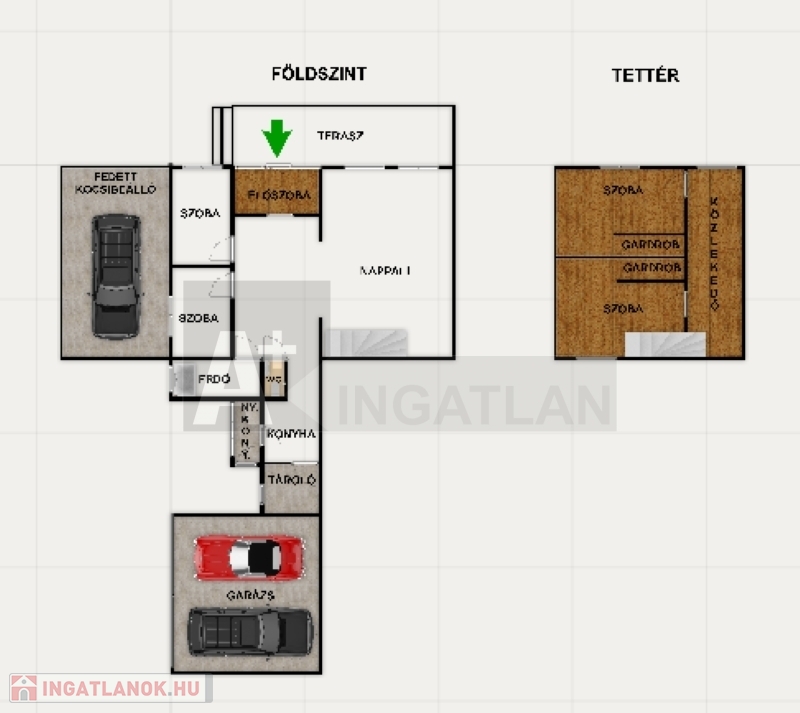 - az épület mellett fedett kocsibeálló, az épület mögött 2 állásos garázs épült