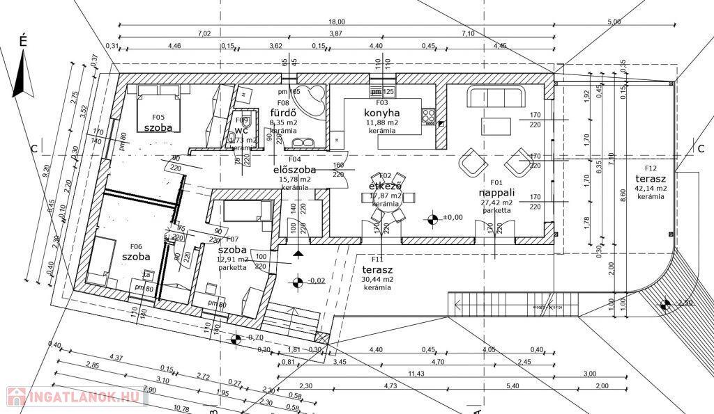 Helyiségek: nappali (21,4 nm), konyha (11,9 nm), étkező (17,9 nm), 3 szoba (13,5 és 12,9 és 11 nm), 2 fürdő (7,1 és 3,2 nm), kamra (4,7 nm), közlekedő (17,4 nm), gardrób (2,6 nm) és extra beépíthető tetőtér (42 nm).
