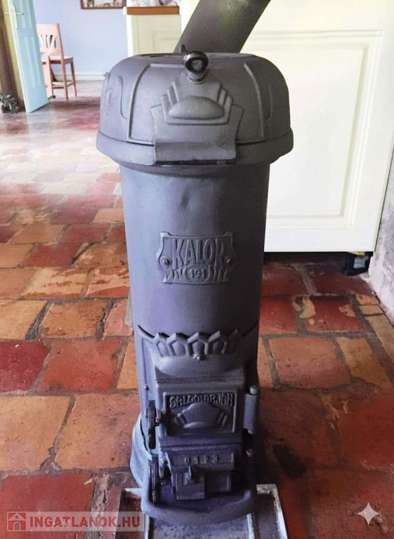 A nappali-konyha központjában álló öntöttvas-kályha melegséget és rusztikus eleganciát sugároz, kiegészítve a helyiségeket borító rusztikus kő padló burkolattal.