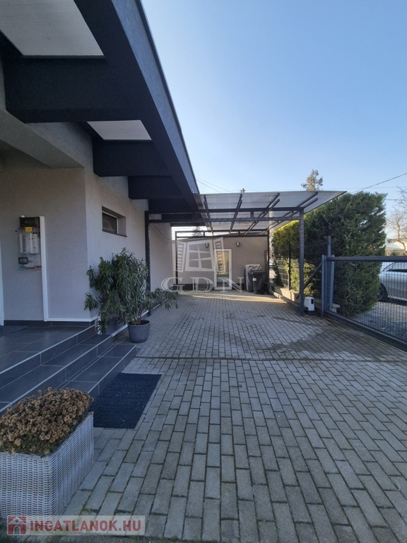 A telken az utcafrontról elektromos garázskapuval megközelíthető garázs is rendelkezésre áll, valamint az elektromos kertkapun keresztül egy fedett, térkövezett gépkocsibeálló is helyet kapott