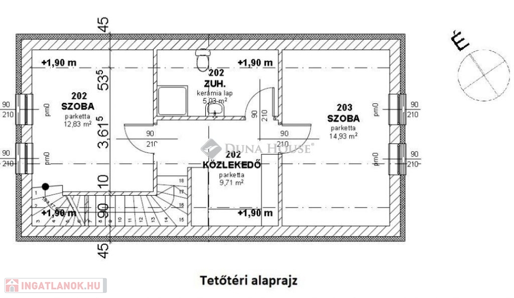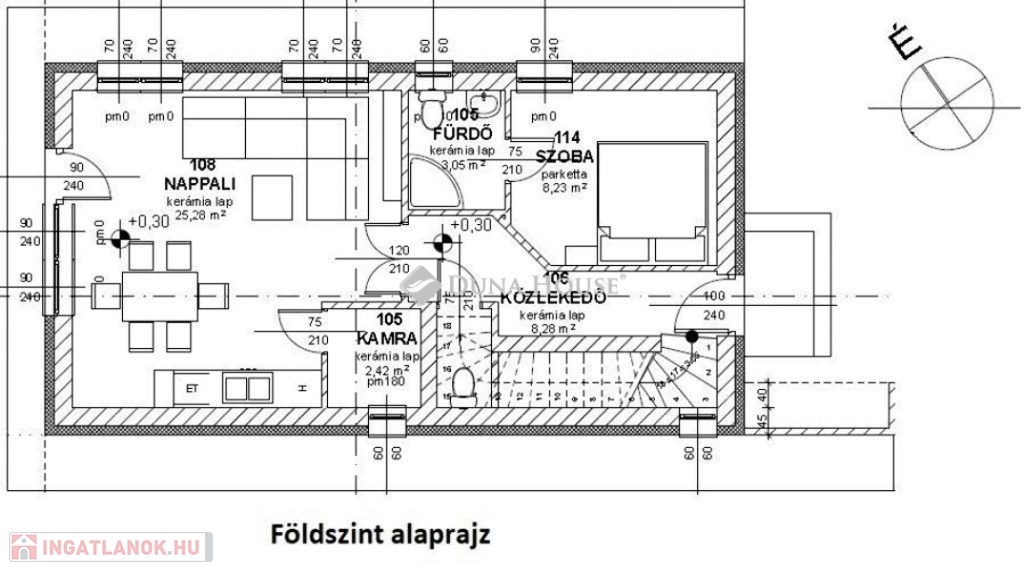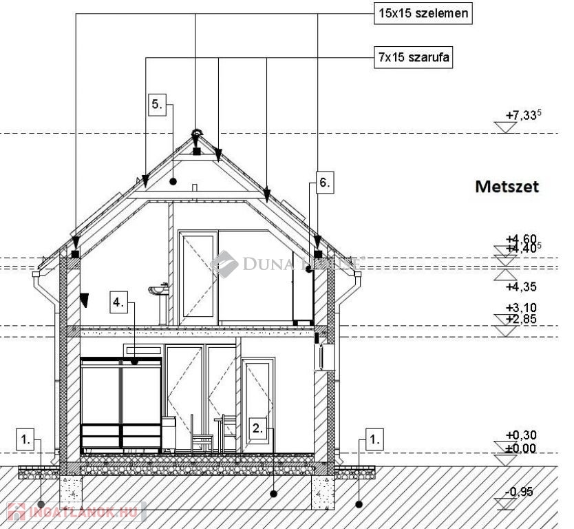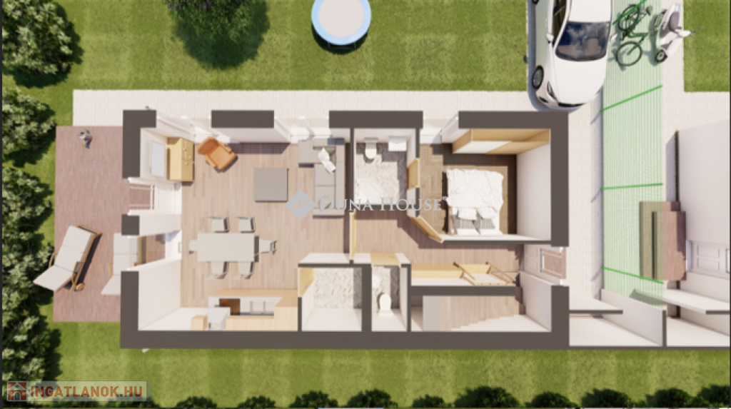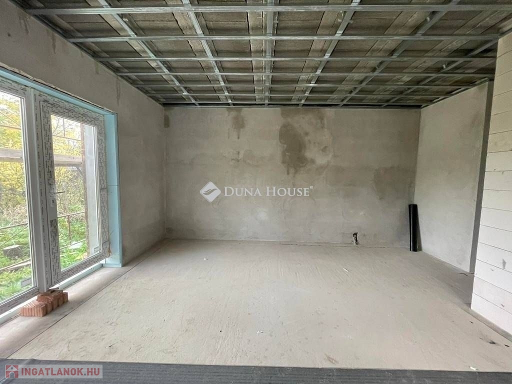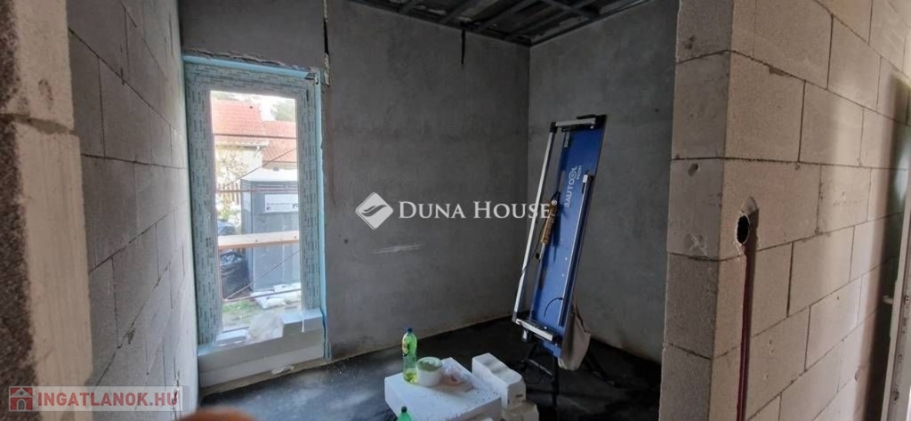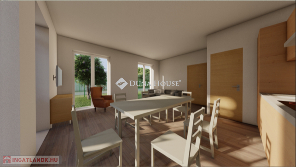 Egy telken belül - megosztott használatban - két egyforma ház épül. Ehhez az ingatlanhoz 234 négyzetméter alapterület tartozik. A telken elhelyezkedő ház 103 négyzetméter. Két szintet kapott. Az alsó szinten kialakításra került egy nappali + konyha, egy szoba, fürdőszoba + WC, közlekedő, illetve egy kamra. A nappaliból nyílik a terasz, ami 18 négyzetméteres. A lépcsőn feljutunk a tetőtér közlekedőjébe, ahonnan külön nyílik két szoba, illetve egy zuhanyzó + WC.