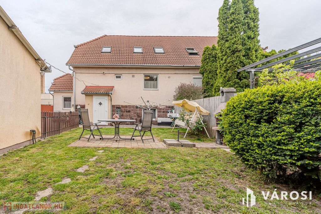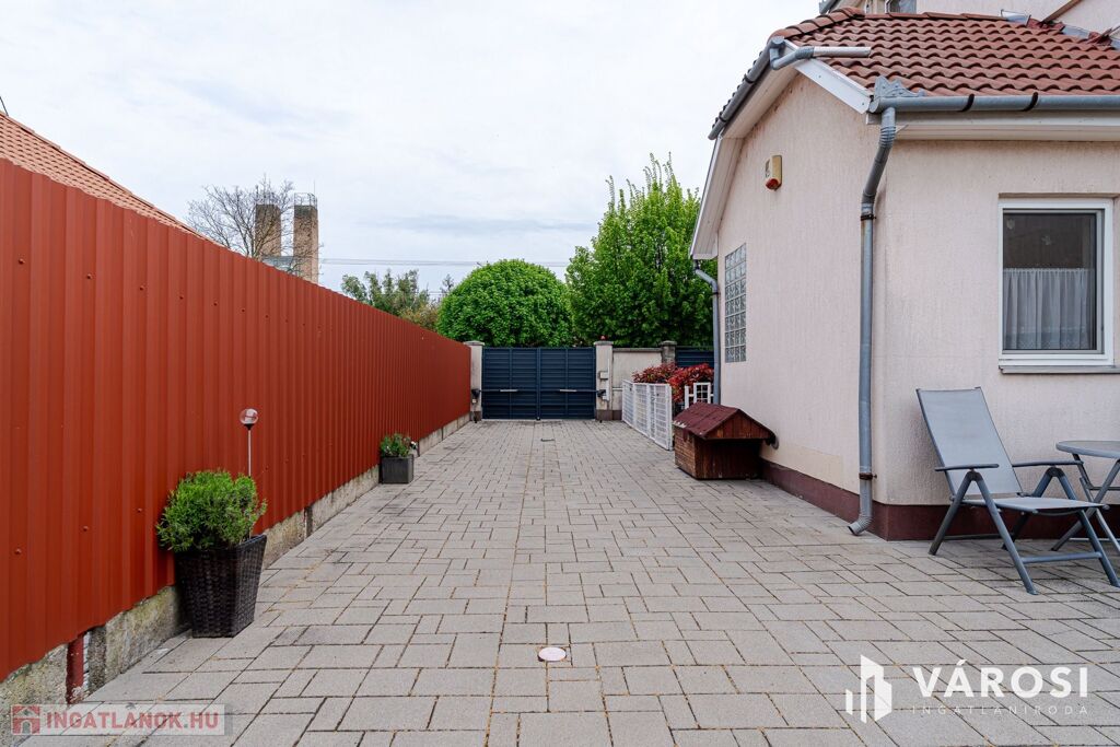 A 435 nm-es telek hátsó részén parkosított pihenőkert található. Az udvar igényesen térkövezett, a bejutást pedig elektromos kapu teszi kényelmessé.