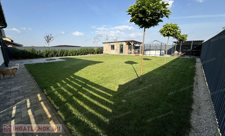 A 840 m2 alapterületű telek rendezett, kerítéssel körülvett, az előkertben 2 elektromos tolókapu található, amelyek a garázshoz és a fedett gépkocsibeállóhoz biztosítanak bejárást. A kert részben térkövezett, részben füvesített, öntözőrendszerrel, melyet fúrt kút és szivattyú működtet. A telken található egy 16 m²-es tároló és egy 28 m²-es szigetelt faház, melyben külön mosdó