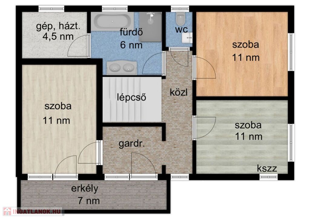 - Nappali, konyha, WC, előtér, terasz,3.szoba, fürdő, erkély, háztartási helyiség, kamra.