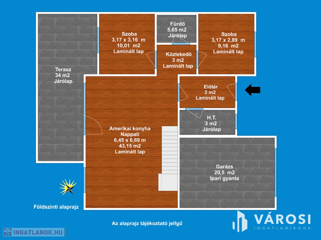 A ház, egy 46 nm-es amerikai konyhás nappalival, összesen 5 hálószobával - melyből 2 a földszinten található - , és 2 fürdővel - a földszinti tusolóval és w.c.- vel, az emeleti káddal, tusolóval, és w.c.-vel - , valamint háztartási helyiséggel, előtérrel, közlekedőkkel, rendelkezik. Központi része a "szemmel alig látható " amerikai konyha nappali, amely számtalan családi programnak adhat helyet, és innen könnyen elérhető nem kis méretű terasz és a hozzátartozó kiválóan kezelt udvar is.