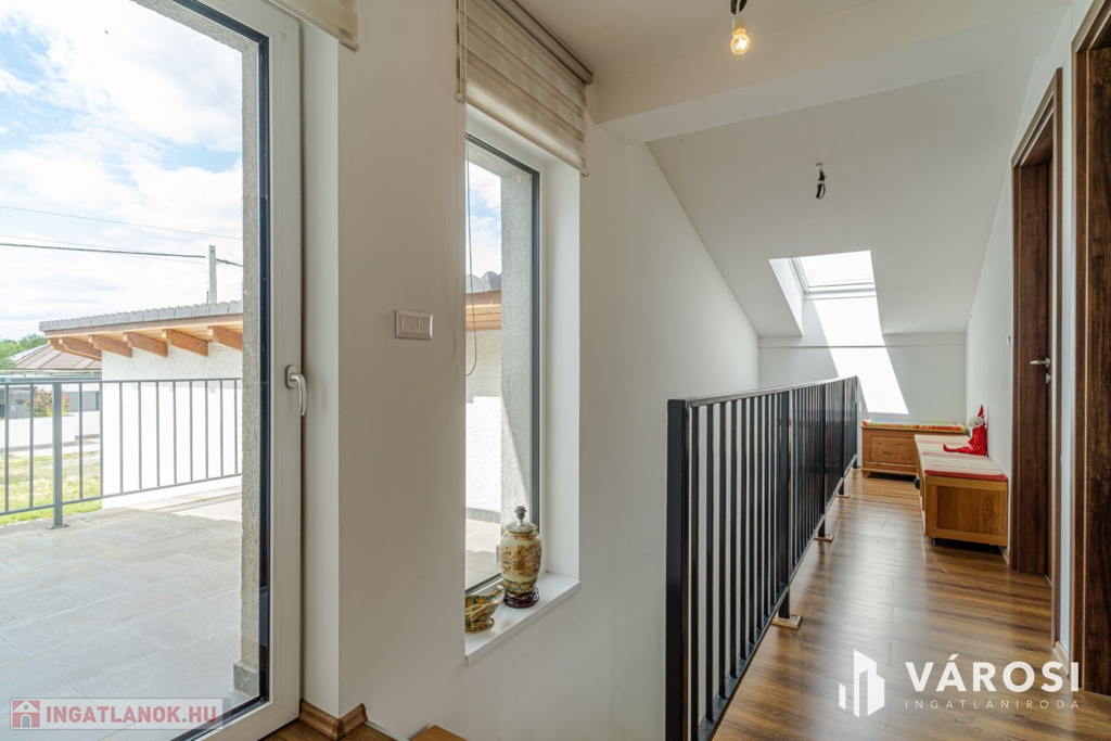Szeged Újszeged a Lőtér lakóparkban, eladó egy 2019-ben épült, Kiváló állapotú, 135 nm-es élettérrel rendelkező ,tégla építésű, gáz cirkó fűtésű, 4 kw - os napelem rendszerrel ellátott, nappali plusz öt szobás, dupla fürdős, belső szintes, erkélyes,,teraszos (34 m2), ikerház, amelyhez egy 20,5 nm-es garázs, és összesen 380 nm es telek is jár hozzá parádés kerttel.