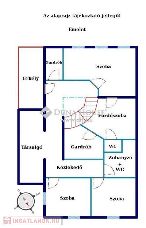 Az emeletre kényelmes, elegáns lépcsőn jutunk fel. Ezen a szinten két lakószárny került kialakításra, melynek központi része a társalgó. Előtérrel szemben 10,44 m2-es terasz nyílik, jobbra egy gardrób szoba ad lehetőséget a tárolásra, tovább haladva a szülői háló, a fürdőszoba, az innen nyíló külön légtérben kialakított wc és egy gardrób érhető el. A közlekedőből nyílik a kissé elszeparált 2 külön bejáratú hálószoba, a fürdő és a kézmosóval felszerelt mellékhelyiség.