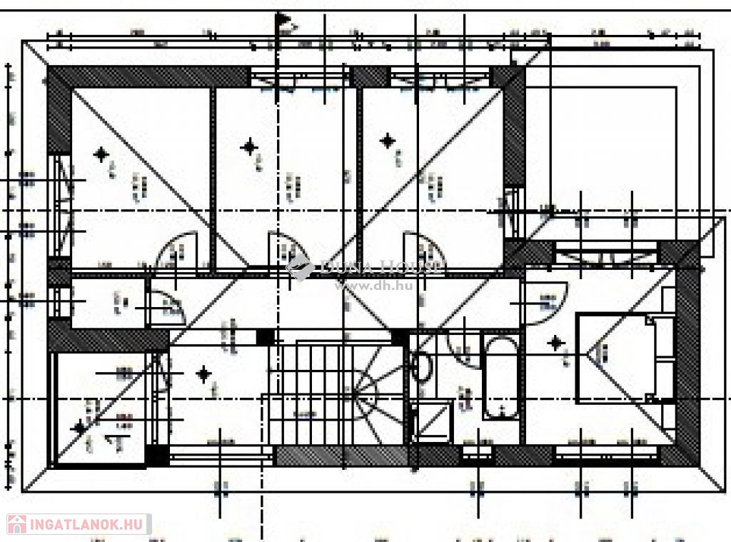 Emelet: 4 külön bejáratú szoba, fürdő, szeparált mellékhelyiség és loggia (lakótér: 60,86 m2 + loggia: 4,43 m2).