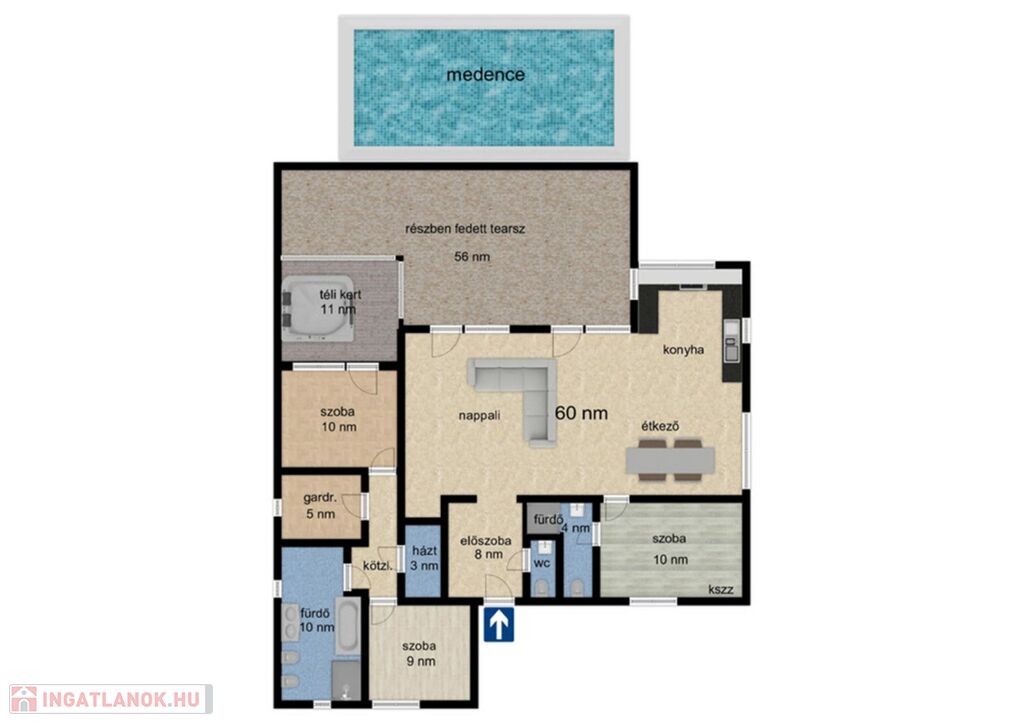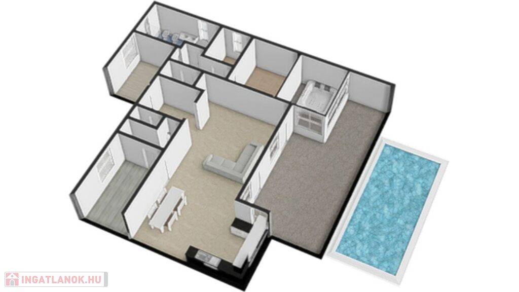 - Amerikai konyhás nappali,3. külön szoba,2. fürdőszoba, gardrób, külön WC, télikert,