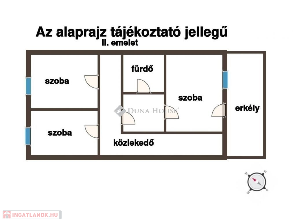 2. emelet: három darab, szintén 16 m²-es szoba, szintén közös fürdőszobával.