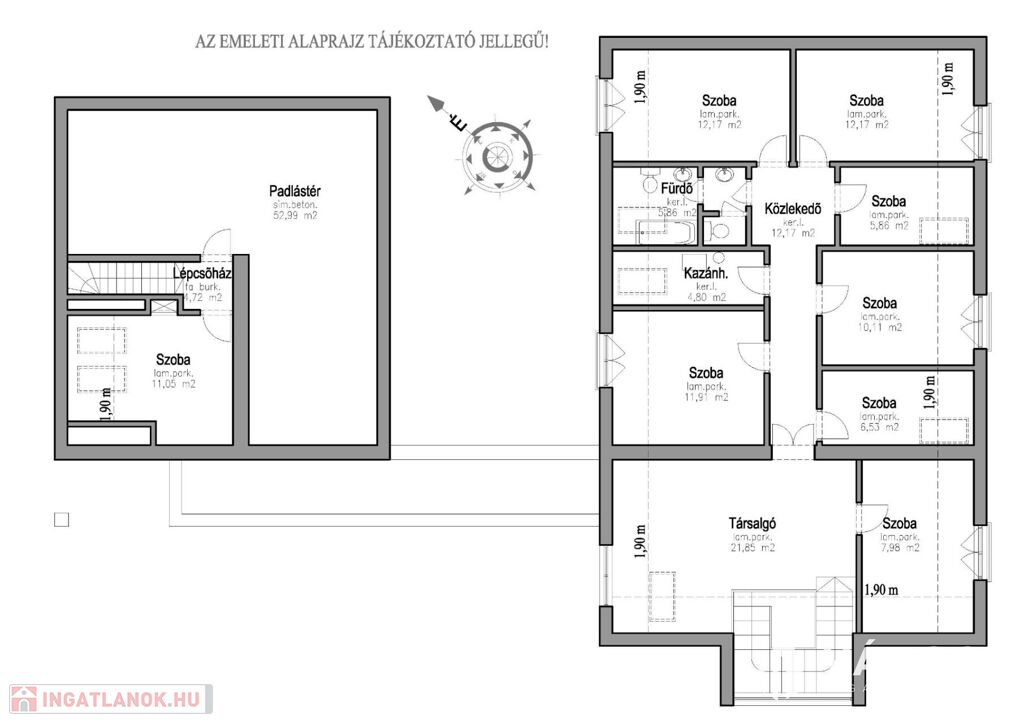 szoba, lépcsőh., beépíthető tetőtér
