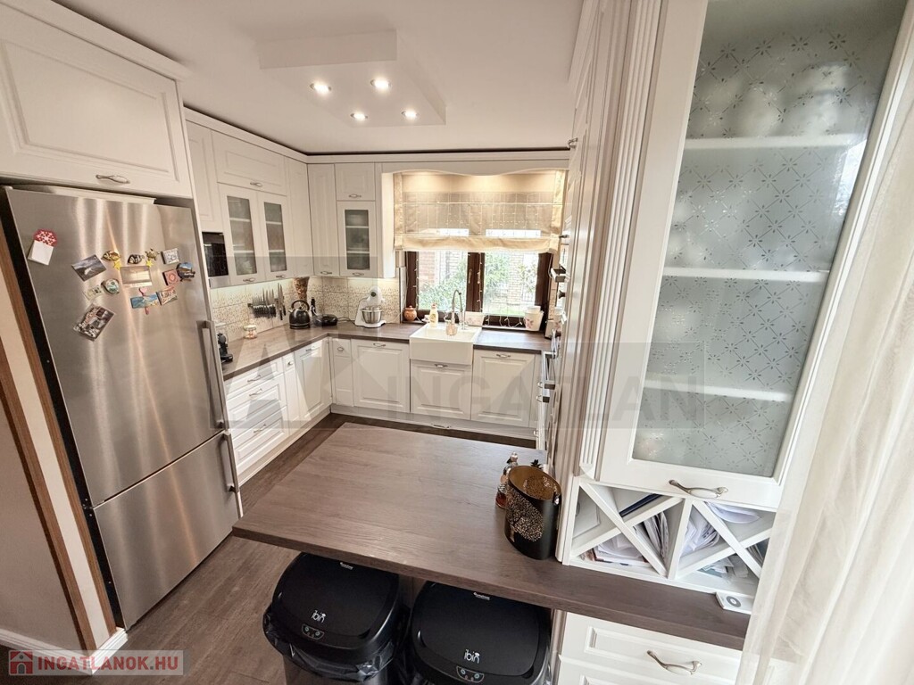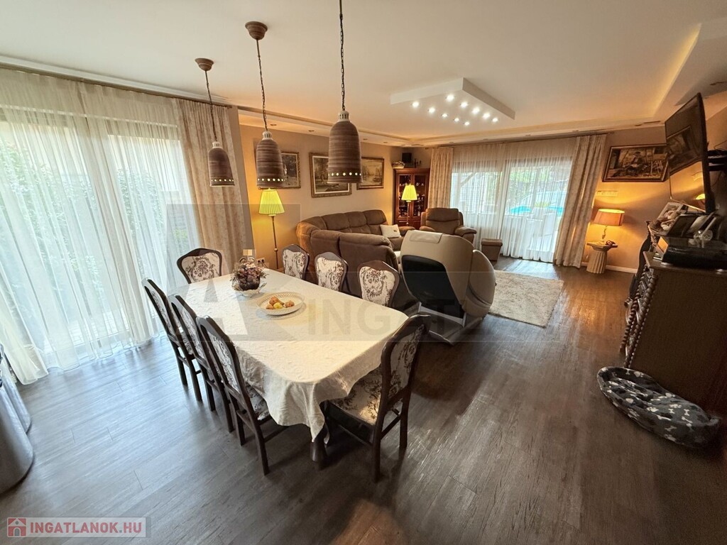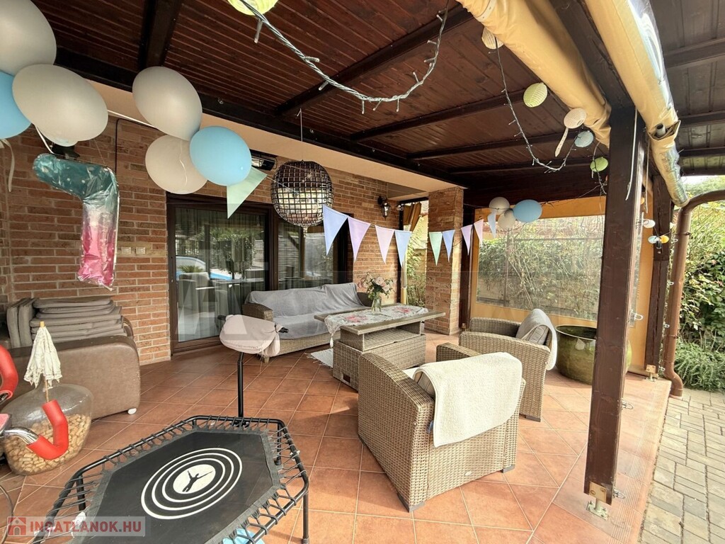 A két szintes, 198 m2-es ház + közvetlen a nappalihoz kapcsolódó, 20 m2 téliesíthető terasz és a kert végében megépített, szintén teljesen felszerelt, téliesíthető, grill terasz , fürdőszobával, wc-vel: