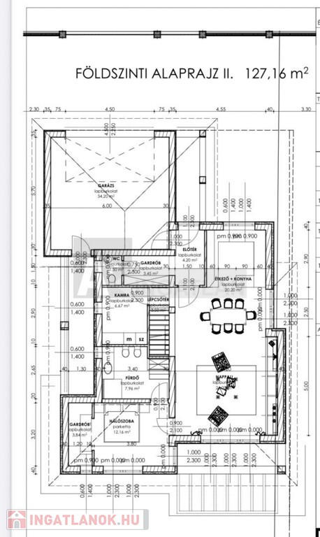 -földszint elrendezése: 34 m2-es garázs , előtér , gardrób, vendég mosdó , kamra és háztartási helyiség és a mediterrán otthonok központi tere a napfényes amerikai konyhás nappali , a közösségi élet színtere , amely elhúzható üvegajtóval kapcsolódik a teraszhoz és mediterrán parkosított kerthez, medencéhez,
