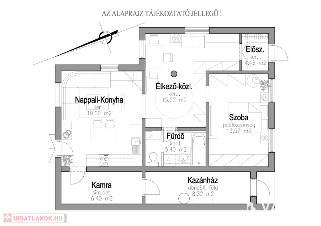 - Nappali-Konyha: ~19,00 m2