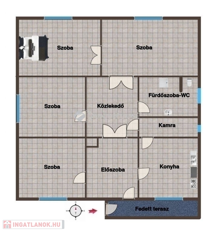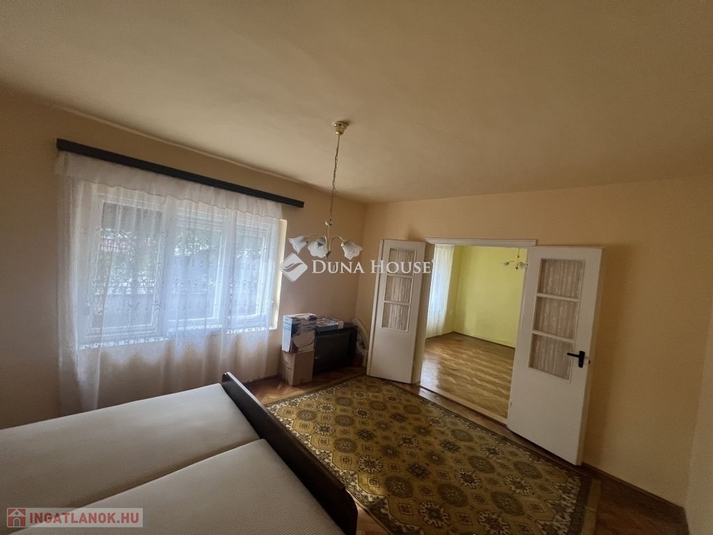 A fedett teraszról nyílik az előszoba, ahonnan elérhető a konyha és egy szoba, amely akár étkezőként is használható. A közlekedőből nyílik a kamra, a fürdőszoba, a WC és egy másik hálószoba. Az utcafronti tágas nagy szobából egy kisebb helyiség nyílik, amely kiváló lehet dolgozószobának, gardróbnak vagy gyerekszobának.
