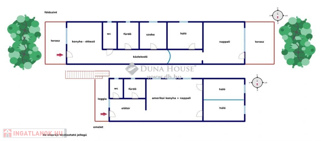 Emelet: amerikai konyha+nappali, szoba, fürdő, toalett, előszoba, loggia = 58,4 m2