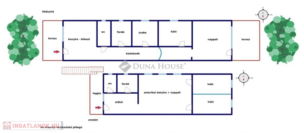 Emelet: amerikai konyha+nappali, szoba, fürdő, toalett, előszoba, loggia.