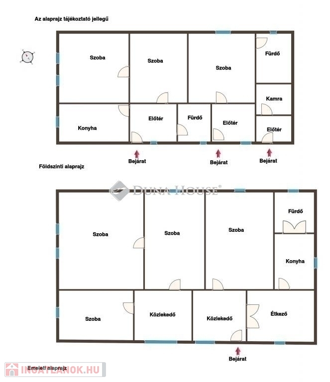 Felső szint: 4 szoba, konyha, fürdő, kamra, étkező, közlekedő