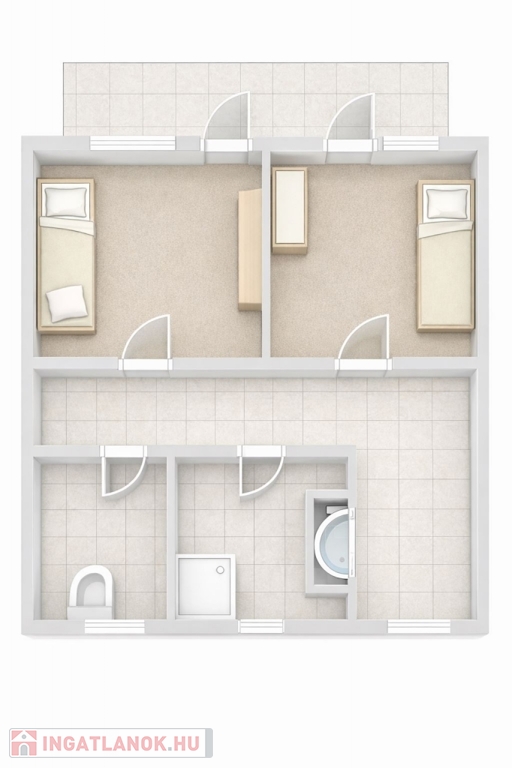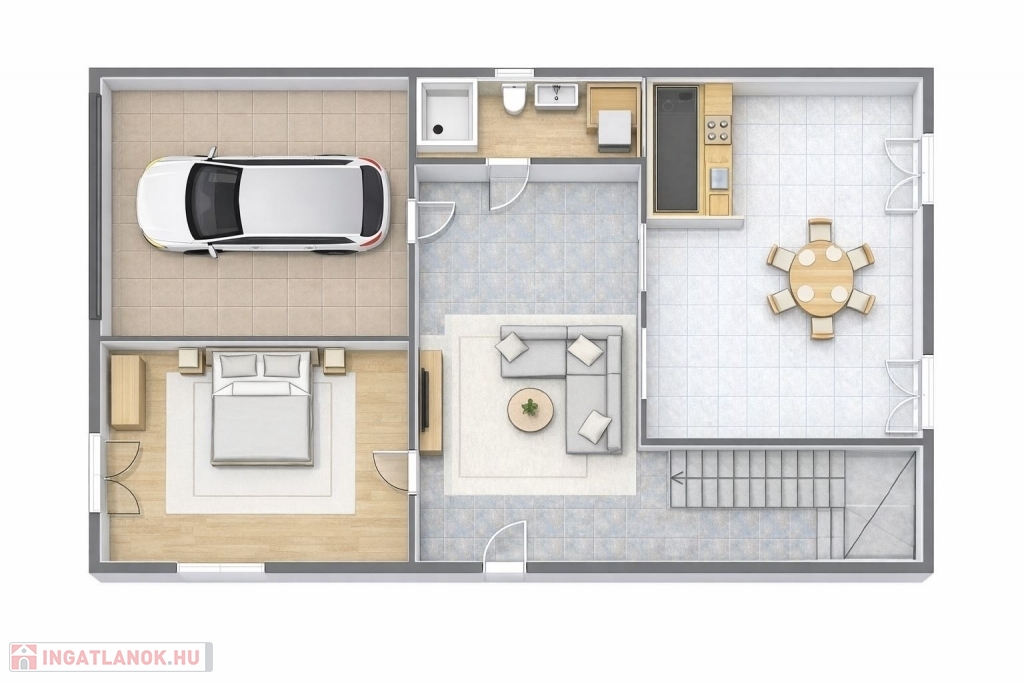 - 70 m² földszint: nappali + 1 szoba, összkomfort, garázzsal