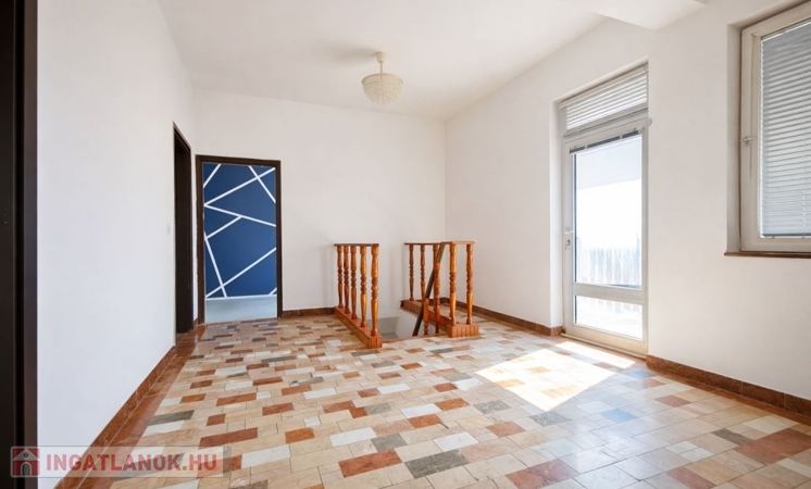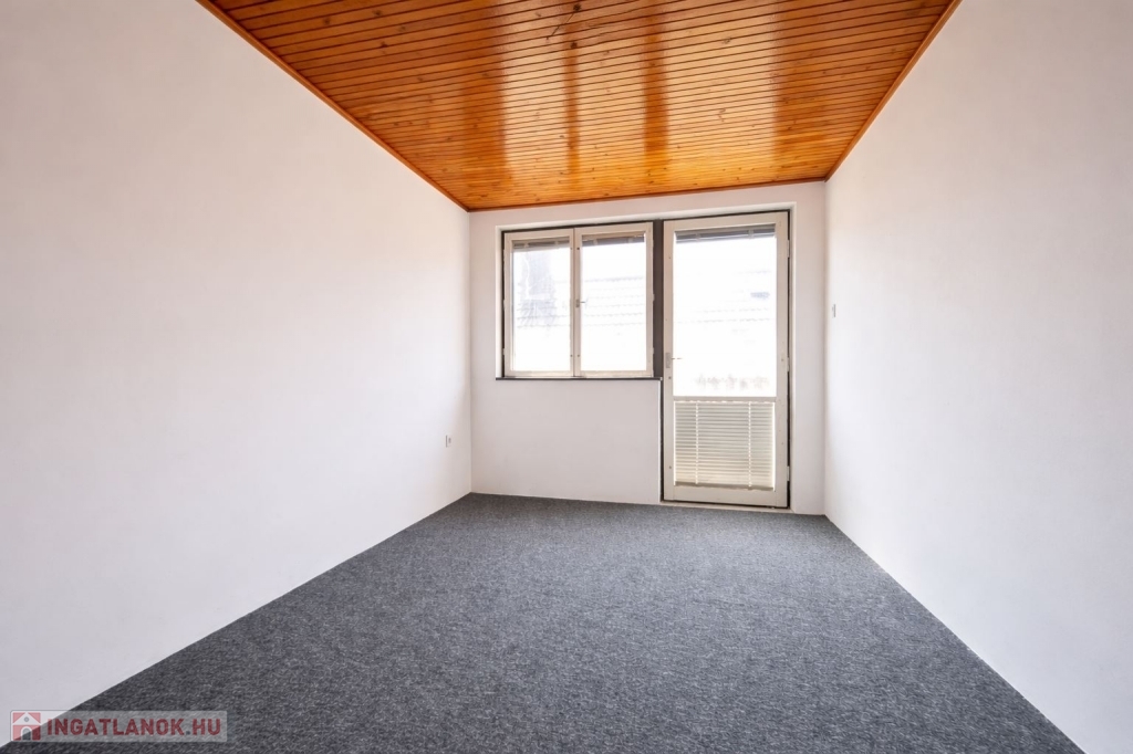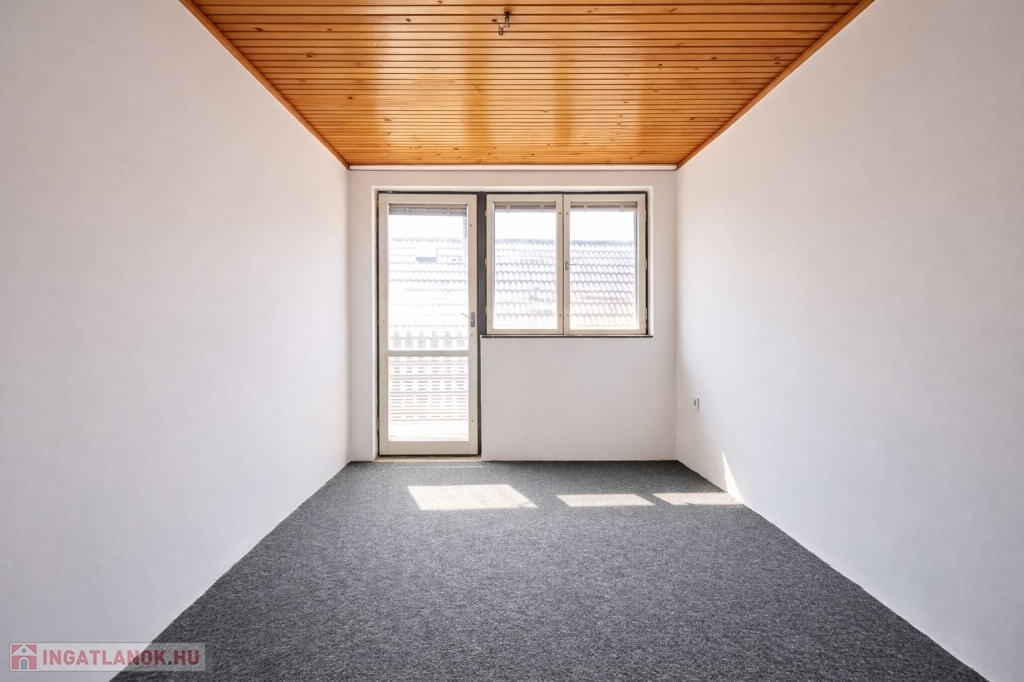 - 100 m², külön bejáratos emelet + tetőtér: nappali–konyha–étkező + 3 hálószoba, 2 fürdőszoba