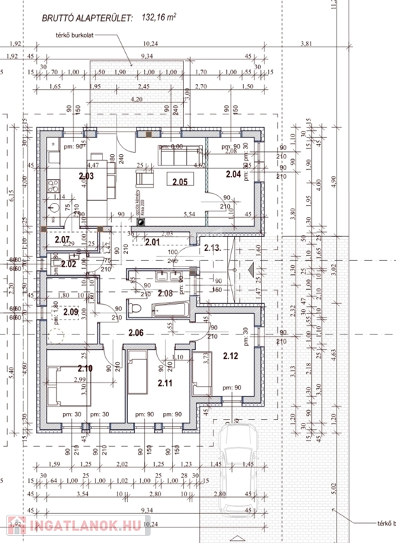 ● Nappali + 4 hálószoba + kamra + háztartási helyiség+ fürdőszoba+ vendég wc+ terasz(16m2)