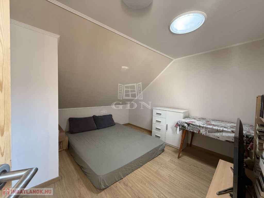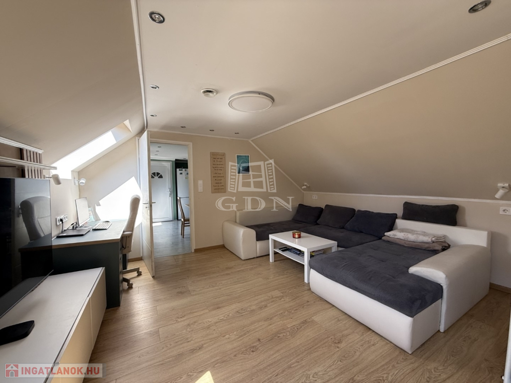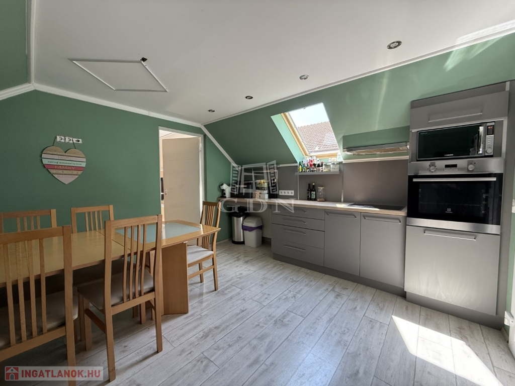 • Tetőtéri lakás (54 m²): modern, fiatalos stílusban kialakított, előtér, konyha-étkező, nappali, két hálószoba, fürdőszoba WC-vel. Klimatizált, inverteres (7 kW és 3,5 kW) hűtő-fűtő klímákkal felszerelve.