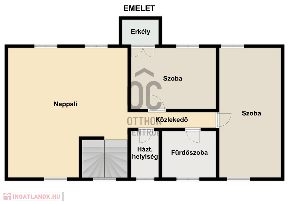 Emelet: 2 hálószoba, fürdőszoba, valamint egy 36 m²-es nappali (igény szerint 3 hálószobává alakítható)