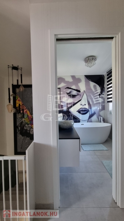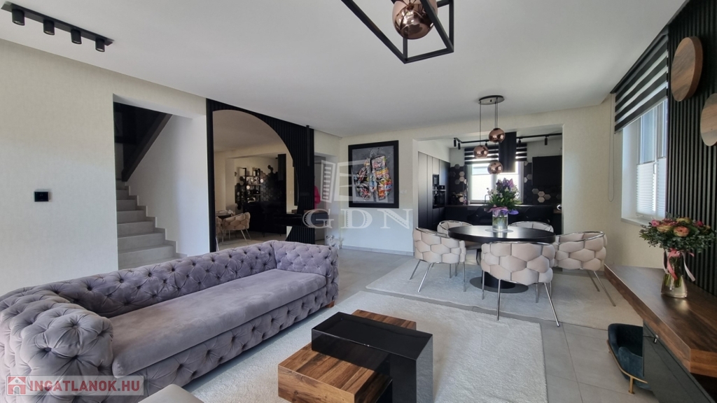 H-004303. Ráchegy, frekventált, kedvelt részén, összközműves építési telken, lakóparki környezetben, eladó egy 2022-ben épült kétszintes, igényes, egyedi kivitelezésű 150m2 hasznos alapterületű, nappali + 4 szobás+ jakuzzi, szaunaház/ konditeremmel ellátott önálló telekterülettel rendelkező családi ház, garázzsal, terasszal.