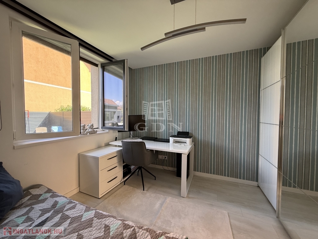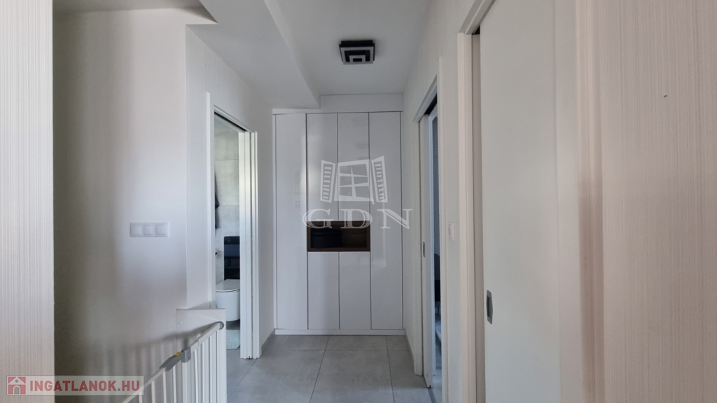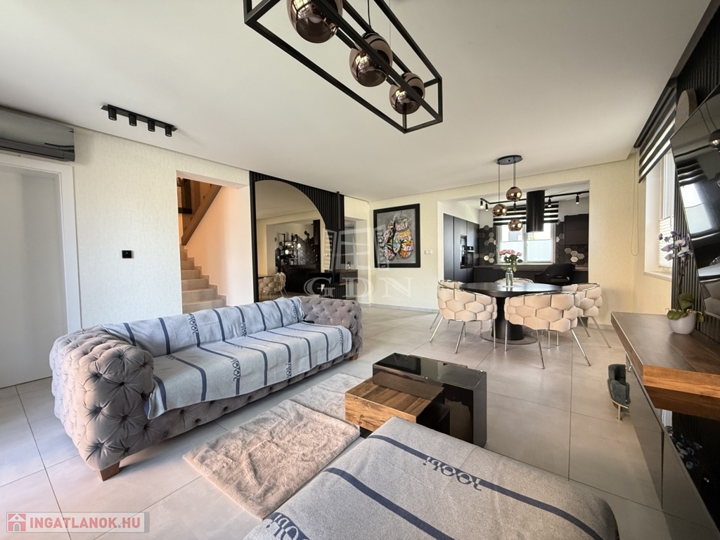 A ház téglaépítésű, szigetelt, tágas, világos, körbe napozott, minőségi anyagokból készült. A burkolatokat tekintve a szobákban magas minőségű laminált padló, a nappaliban a közlekedőben, valamint a konyhában és a vizes helyiségekben jó minőségű járólap található. A nyílászárók 3 rétegű műanyagból készültek, hőszigetelt üvegezéssel, rajtuk redőny és szúnyogháló található. A házban klíma kiépítésre került. A 20m2-es terasz, kényelmes pihenést biztosít. Az utcai kapu elektromosan nyitható. A telek örökzöldekkel, dísznövényekkel parkosított, pihenő terasz, gyermekjátszótér, és egy 27m2-es szauna/konditerem kiépített zuhanyzóval, gépészettel, valamint egy jakuzzi található benne.