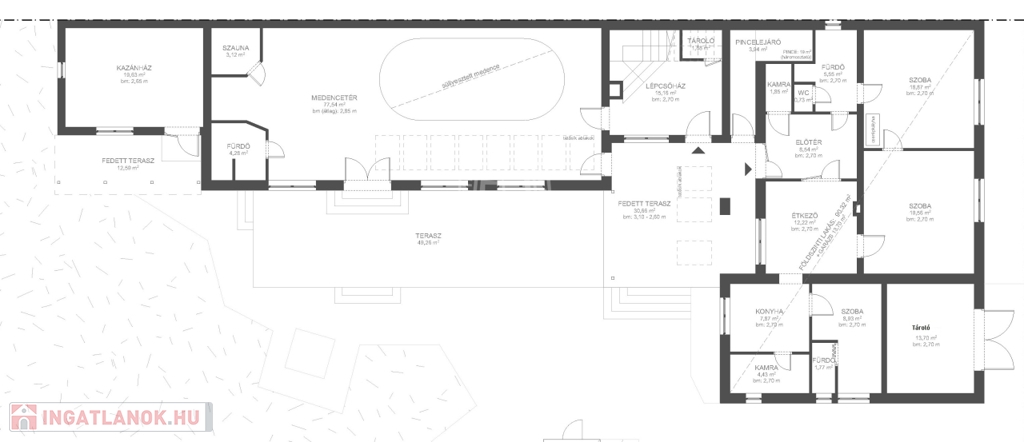 - 80 négyzetméteres pihenőtérben ellenáramoltatóval, vízmasszázzsal ellátott úszómedence, finn és infraszauna, zuhanyzó wc is helyet kapott – mindez közvetlen kapcsolattal a kazánházhoz és a háztartási helyiséghez, amely a lépcsőházból, a kert felől és a teraszról is külön bejáraton keresztül is megközelíthető.