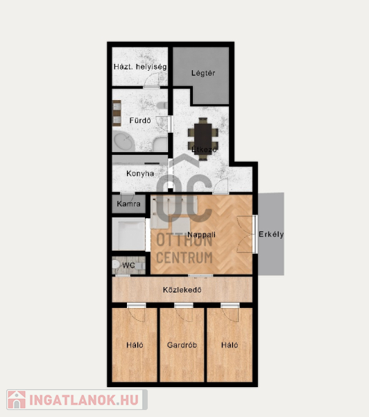 • Emelet: nappali erkélykapcsolattal, három hálószoba, konyha-étkező kamrával, fürdőszoba, külön WC, háztartási helyiség, panorámás erkély