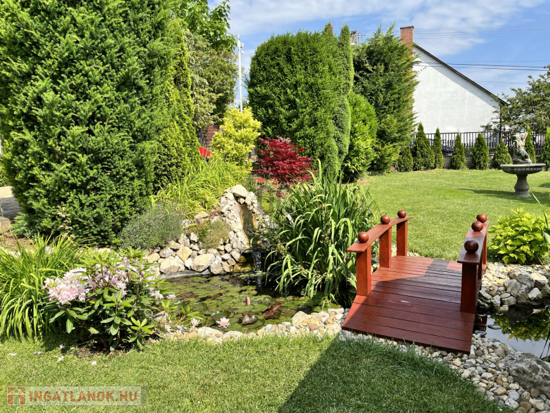 A ház egy 1421 m²-es, parkosított dupla telken helyezkedik el, amely két utcáról is megközelíthető, többállásos parkolóval. A telket gondozott növényzet, óriás hibiszkuszok, hortenziák, fenyők, valamint egy kerti pavilon, sütögető és koi pontyokkal, tavirózsákkal díszített kerti tó teszi különlegessé. Az automata öntözőrendszer és a robotfűnyírók gondoskodnak a folyamatos harmóniáról.