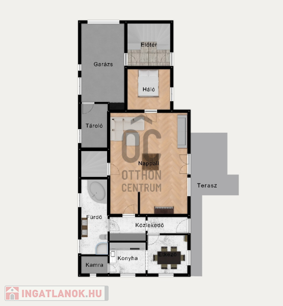 • Földszint: 45 m²-es nappali teraszkapcsolattal, étkező, konyha, hálószoba, fürdőszoba, garázs, tároló