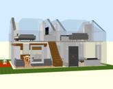 - külső falazat: 12x12 - es fa pillérvázas szerkezet, kívül OSB-3 burkolat és 5cm DRYVIT hőszigetelő rendszer, valamint gipszkarton burkolat