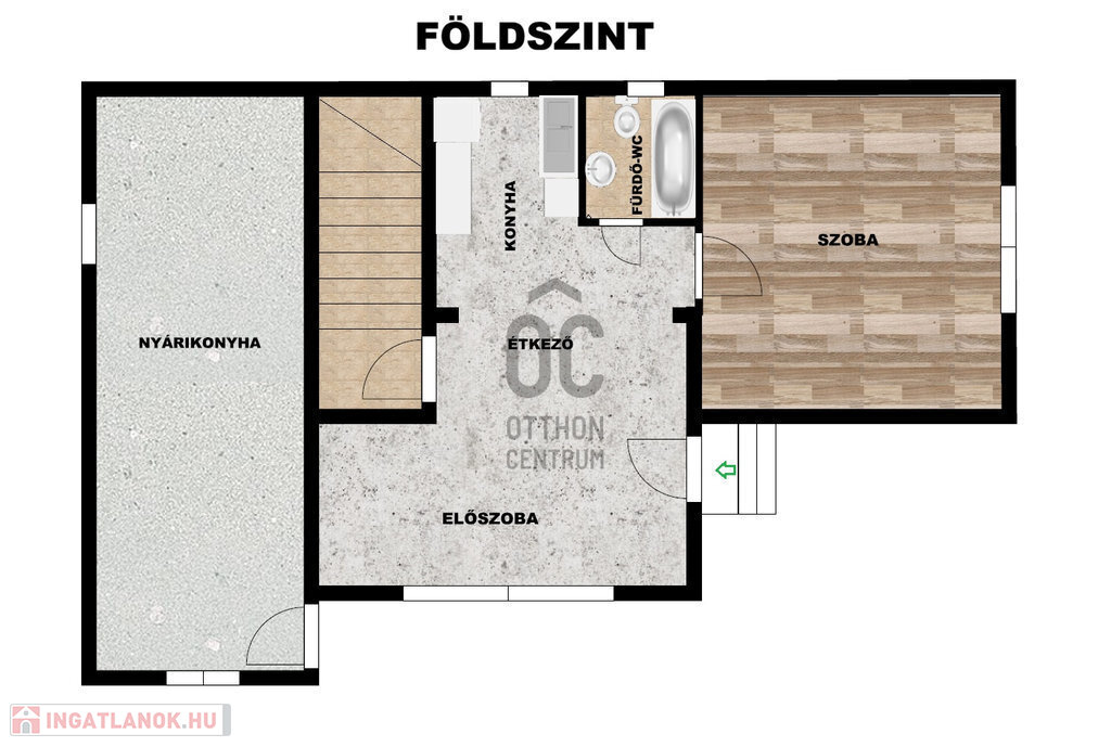 Földszint (47,4m2): előszoba, étkező és konyha egy légtérben helyezkedik el. Innen nyílik még egy szoba, egy fürdő-WC és lépcsőház, mely a szuterénbe vezet.