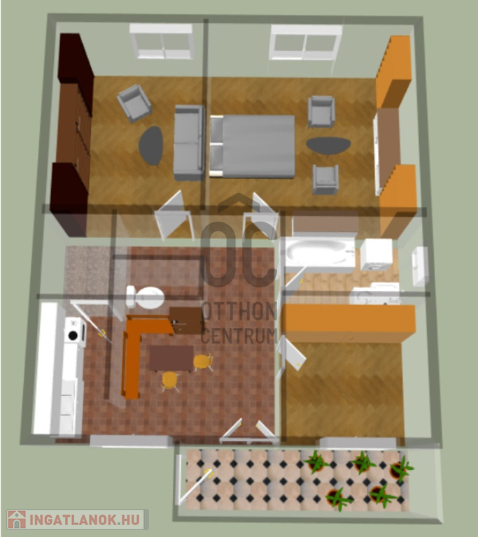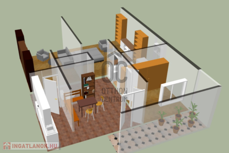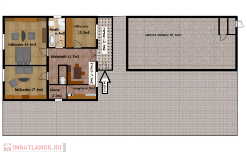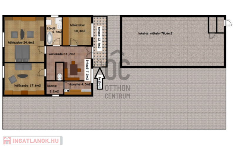 • 96,4 m²-es lakótér, 3 tágas szoba